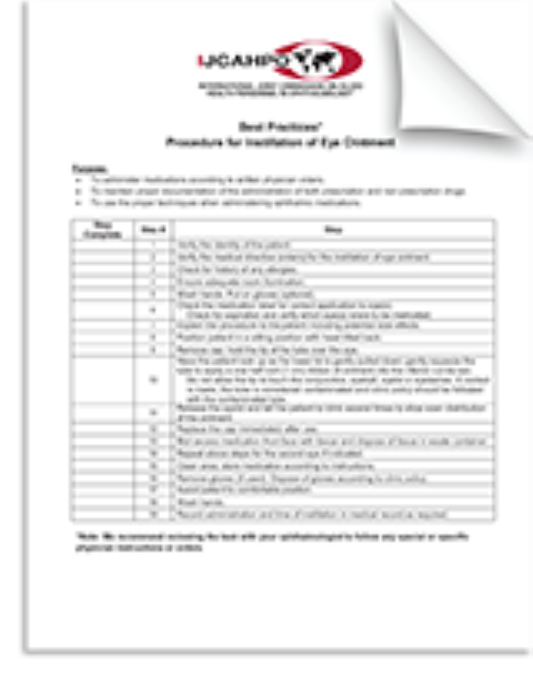 JCAHPO strives to provide best practice information for ophthalmology health personnel. These checklists were included in a JCAHPO webinar 'Best Practices in the Instillation of Eye Drops and Ointments' instructed by William Ehlers, MD. Feel free to download and/or print them for use within your own practice/clinic. It is recommended to review any task with your ophthalmologist to follow any special or specific physician instructions or orders.